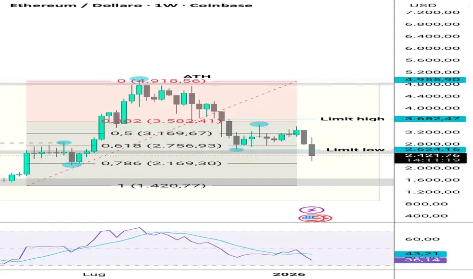 Dopo la corsa partita da $1410 il prezzo forma un High a $2865 - segue lower high a $2118 - continua verso ATH a $4999 sfiorando la soglia psicologica di $5000 su vari grafici - discesa verso lower high a $2624 che ha funzionato da limit low, del range settimanale appena rotto - higher low a $3479 il quale ha formato limit high del range settimanale.
