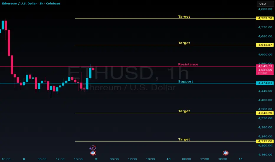 If ETH breaks above resistance 4,549 convincingly (with volume), expect a push toward 4,642, and if that is cleared, the next zone is 4,759.