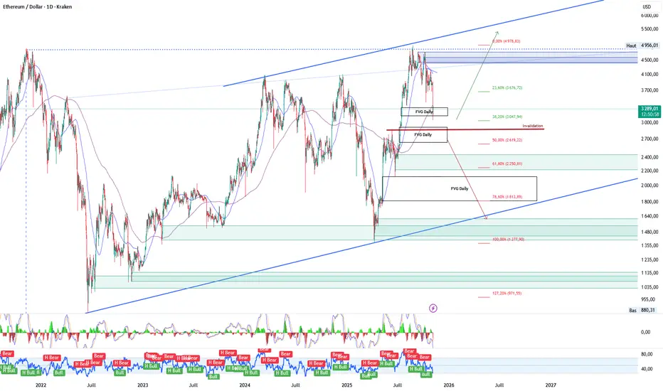 ETH – Daily : charnière à 3 k$ - reclaim ou retracement (en logarithmique)