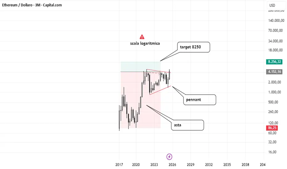 Con l’aiuto di un grafico trimestrale, e facendo ricorso alla scala logaritmica che aiuta molto con le crypto vista la loro pronunciata volatilità, possiamo inquadrare i tre quarti della vita dello strumento come costruzione di un pattern rialzista di asta e pennant