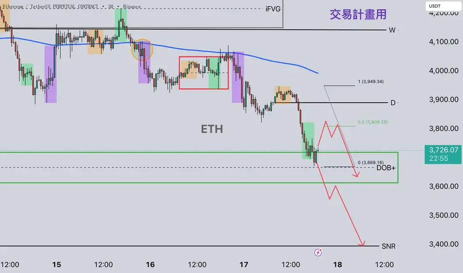 ETH 近期持續走弱,雖在 $3,610–$3,720(DOB+ 吸籌區) 出現短暫止跌