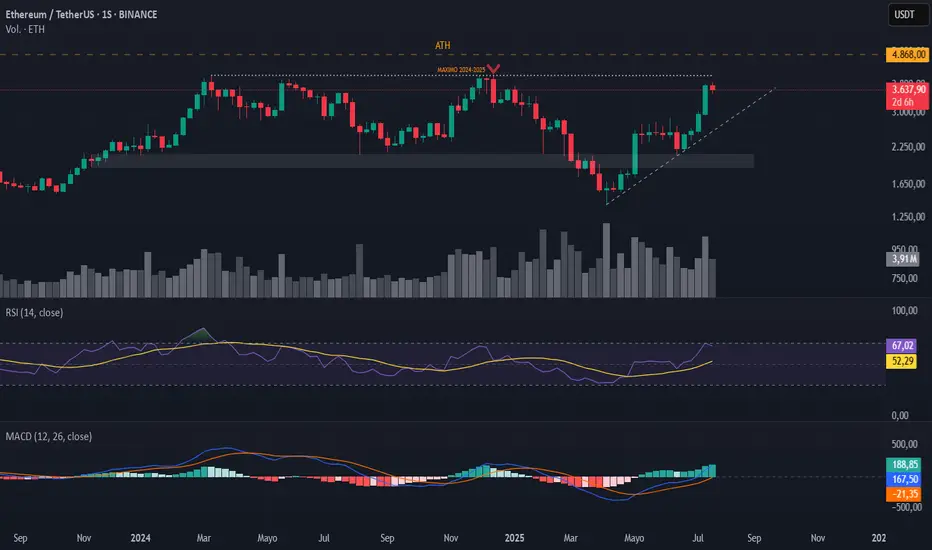 ETH sigue su camino y se acerca a maximos que registro en los años 2024 y 2025, la duda es, permitira los factores externos que ataque esa zona y se encamine de nuevo a intentar atacar su ATH..?