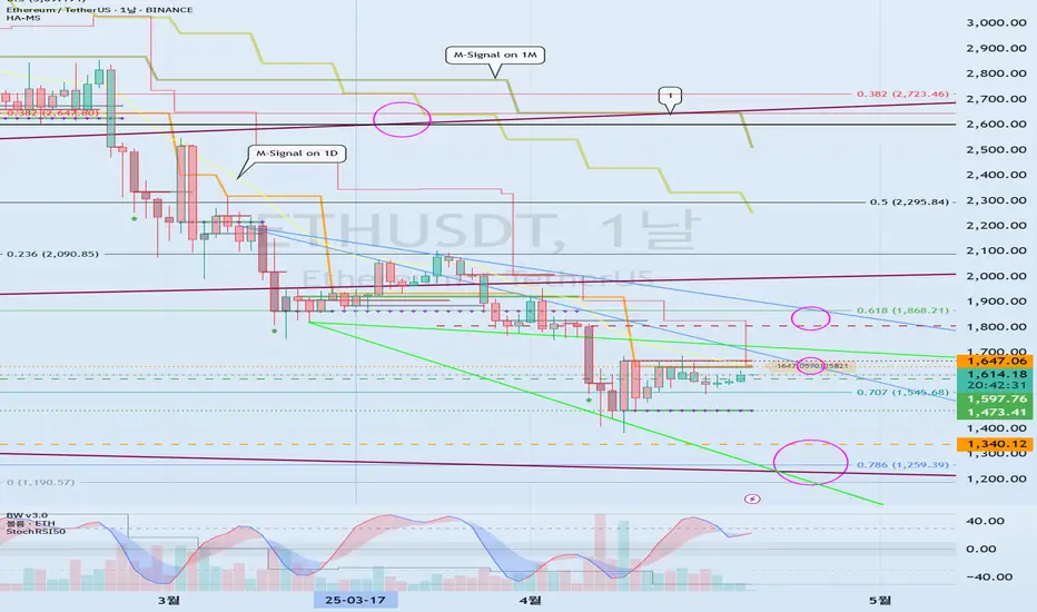 1D 차트의 M-Signal 지표가 1D 차트의 HA-Low 지표 부근을 지나고 있기 때문에 1647.06 이상 상승하여 가격을 유지한다면, 단기 상승세로 전환될 가능성이 있습니다.