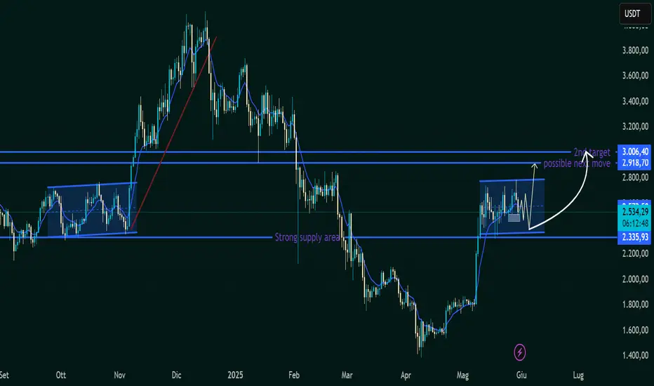 Questo grafico suggerisce una probabile continuazione rialzista per ETHUSDT, basata sulla struttura attuale del mercato e sugli indizi visivi mostrati: