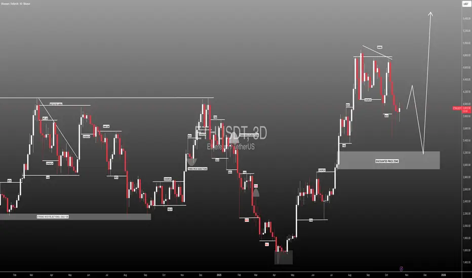 ETHUSDT we believe the price will initially decline before launching from the $3000 price region. This area appears more promising and could function as a discounted price zone. Three target levels are suggested below: