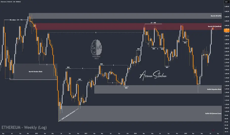 By analyzing the Ethereum chart on the weekly timeframe, we can see that after reaching $3940 and touching the key supply zone, ETH entered a slight correction and is currently trading around $3756. The key question now is whether it can hold above $3440 by the end of the week and push past $4000. If it does, we can expect another bullish leg toward $4100 and $4470. However, if the $3440 support fails, a sharp decline may follow — so this level is critical.