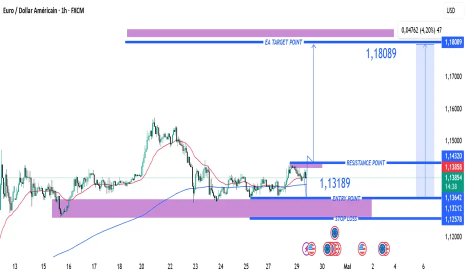 Le graphique indique que le point d’entrée idéal est autour de 1.13860, dans une zone de support marquée en violet. Cela suggère un potentiel de rebond à partir de cette zone.