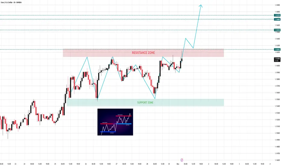 EURUSD is currently trading in a clean and well-defined structure, showing a gradual shift from consolidation to bullish momentum. Price has been oscillating between the Support Zone (1.1540–1.1550) and the Resistance Zone (1.1618–1.1624), forming a sequence of Higher Highs and Higher Lows — a textbook bullish staircase pattern.