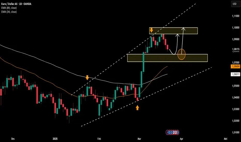 EUR/USD terus bergerak stabil di dalam channel tren naik pada time frame harian. Setelah koreksi ringan, harga mulai mendekati zona support 1.0782 – tempat berkumpulnya EMA34 dan batas bawah channel, membentuk zona potensi impuls. Struktur saat ini belum menunjukkan tanda-tanda pembalikan jelas, justru terlihat seperti akumulasi sebelum kenaikan selanjutnya.