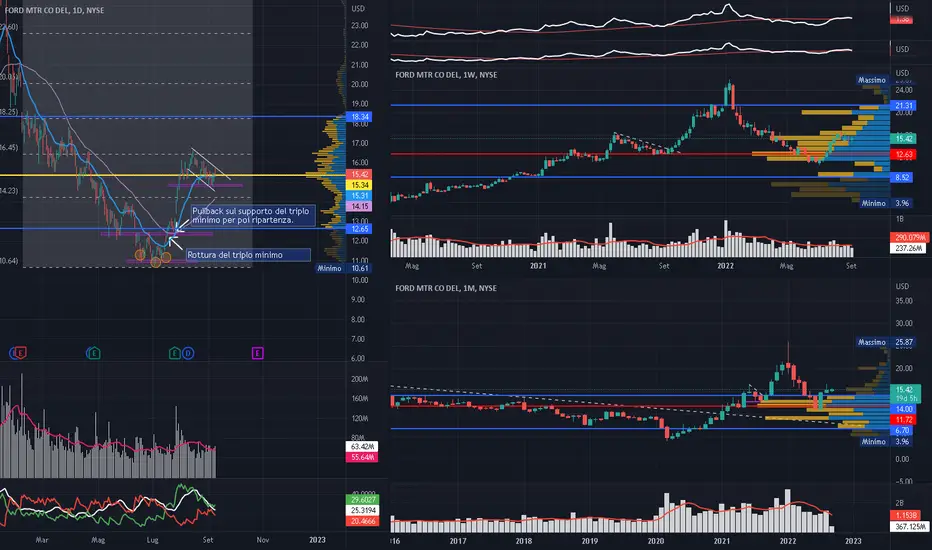 Dopo l'ulteriore spinta rialzista partita ad ottobre 2021 che ha portato il titolo Ford quasi a toccare area 26 e fare dai minimi covid un +500% circa, i prezzi hanno invertito la tendenza alla stessa velocità con la quale sono saliti in quel periodo rimangiandosi in buona parte la super perfomance. L'attuale minimo di periodo importante battuto verso inizio luglio è stato in area 10,60$ circa che dai massimi di periodo è una perdita del 60% circa.
