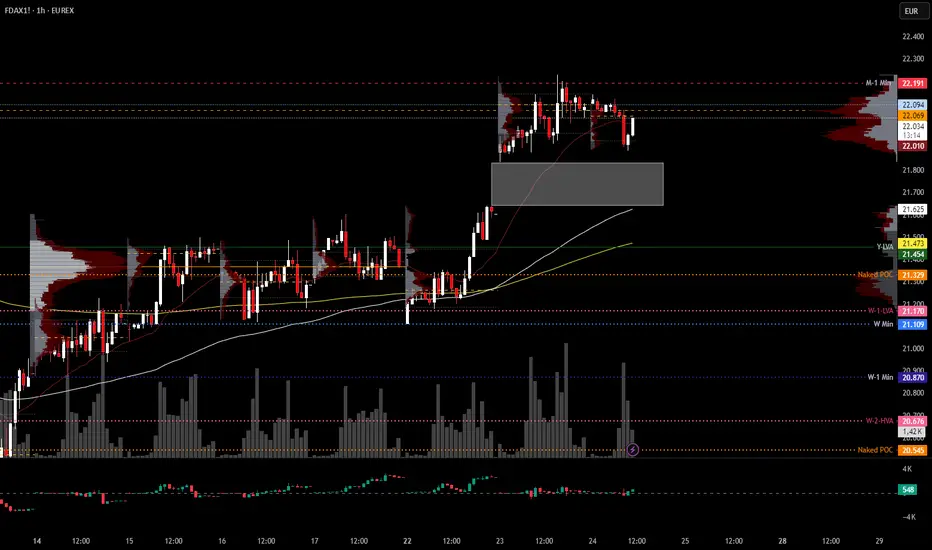 Il volume profile settimanale ci indica che la maggior parte dei volumi sono stati scambiati nella parte alta della settimana al di sopra del GAP UP formatosi in apertura della giornata di ieri, al momento il GAP rappresenta il supporto. Il POC della giornata di ieri è stato ricoperto in apertura della sessione europea odierna, i minimi della giornata di ieri rappresentano il livello chiave per capire se i BID sono pronti a difendere le loro posizioni oppure lasciare campo ai sellers. Mentre la HVA di ieri corrispondente ai massimi odierni rappresenta il livello chiave per constatare eventualmente se i compratori hanno la forza di rientrare all'interno delle quotazioni del mese scorso, rompendo i minimi che al momento fanno da resistenza.