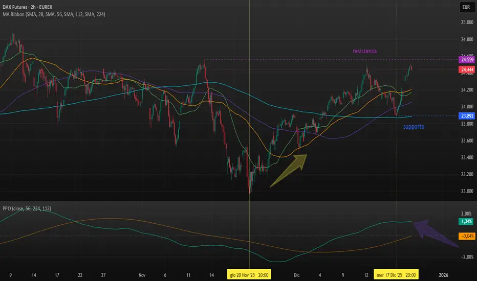 Il ciclo trimestrale è partito sul minimo del 20 novembre, in area 22.960, a seguito di un mese e mezzo di debolezza. I tagli verso l’alto delle medie mobili cicliche (freccia gialla) segnano appunto l’inizio del ciclo, con la forte spinta che rialzista ha fatto salire i prezzi a ridosso della resistenza di area 24.500, ultimo massimo significativo del ciclo precedente. Il recente ritracciamento avvenuto tra il 12 e il 17 dicembre fino ai 23.900 sembra aver portato alla chiusura del primo sotto-ciclo mensile. La repentina ripartenza di giovedì, confermata nella giornata di venerdì, fa pensare a una concreta possibilità di prosecuzione del trend al di sopra dei 24.560 punti all’inizio della prossima settimana. Il price oscillator ben al di sopra della linea dello zero conferma la fase di forza dell’indice (freccia viola in basso).