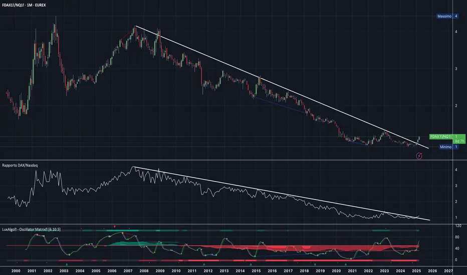 Ho voluto rappresentare graficamente una cosa che, per chi opera nei mercati quotidianamente, risulta abbastanza evidente da inizio 2025, ovvero la superiore performance del Dax (ed in generale dei mercati europei), nei confronti dei mercati americani.