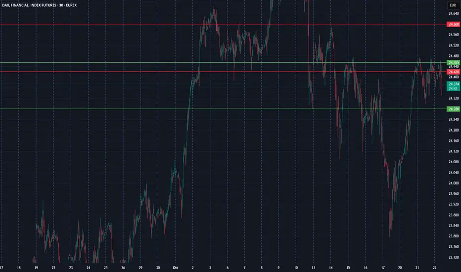 Il DAX supporti in area 24280. Venditori in area 24420. Gamma positività da area 24455 con obiettivo 24600.