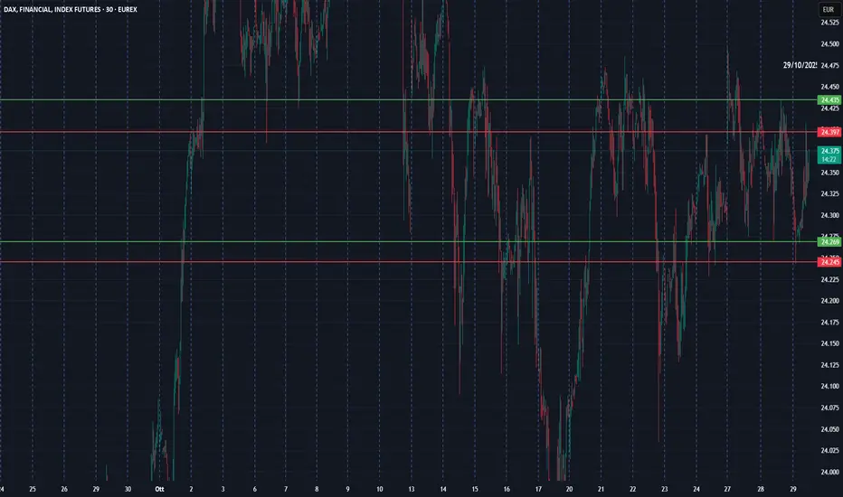 DAX vede supporti in area 24269 e resistenza in area 24397. Gamma negatività sotto 24245. Break-out rialzista a partire da area 24435