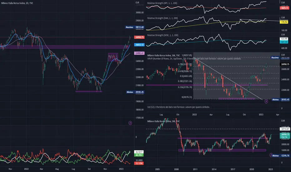- Dai prezzi attuali, mancano circa 1200 punti al raggiungimento del massimo fatto a gennaio 2022. Visto l'attuale momentum rialzista, ci sono buone probabilità che si vada a testare area 28000 circa e penso che, proprio su questi livelli, si potrebbe iniziare a vedere una correzione.