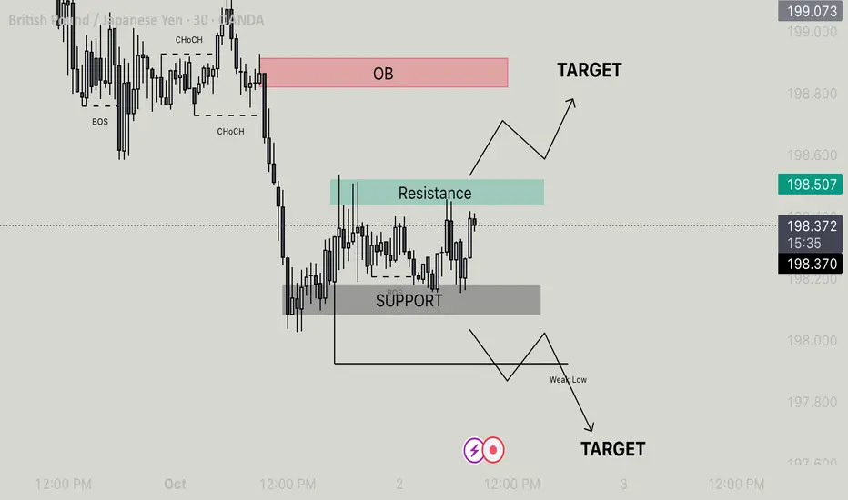 If price breaks above the resistance zone, it could target the Order Block (OB) above, which is a key supply area from the last strong bearish move.