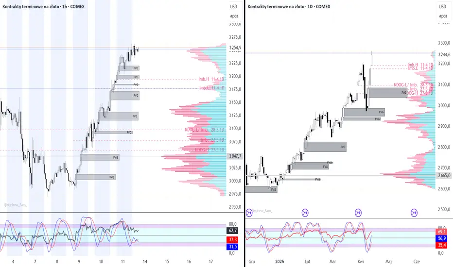 - Widoczne **niewypełnione FVG na H1 i D1** – od $3,220 aż do $3,097