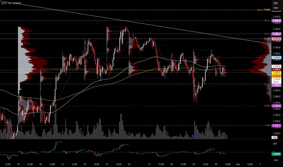 Il volume profile settimanale sembra voler concludere la settimana con una forma a D-shape, con i prezzi in area di balance sul POC settimanale. L'area supportiva è identificata tra la LVA della giornata di ieri (3296$) e il LVN monthly a 3300$.