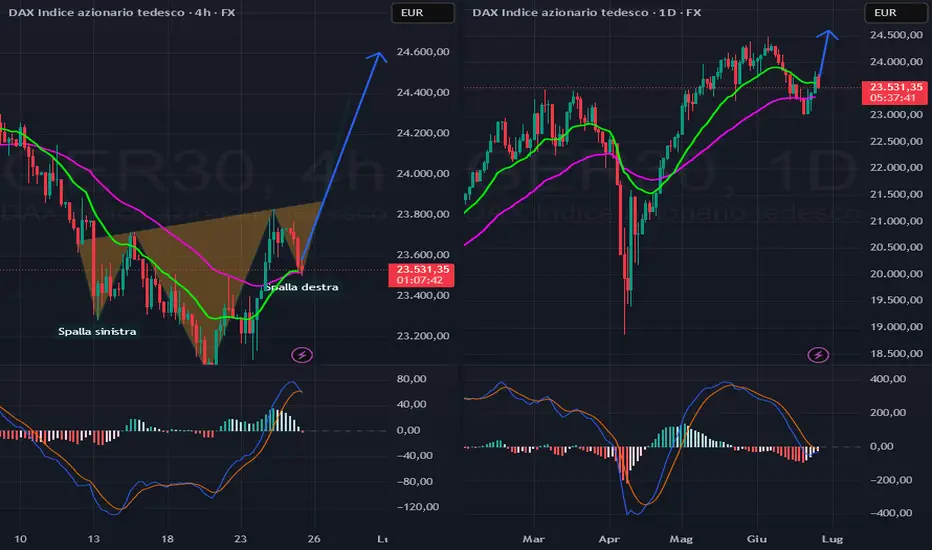 testa e spalle rialzista per il dax. ger30 ha incrociato al rialzo ed appoggiato sulle medie.