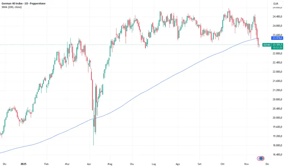 Nonostante la violazione della media mobile a 200 periodi, il Dax continua a scambiare all’interno della cruciale fascia di supporto compresa tra 23.250 e 23.000 punti, un’area che negli ultimi mesi ha più volte intercettato flussi in acquisto e generato inversioni di breve periodo.