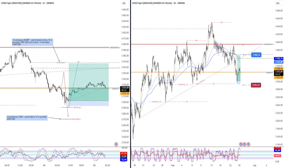* Rynek odbija od razu do 3330 USD (**idealny TP1**) – potem nieco zawisa.