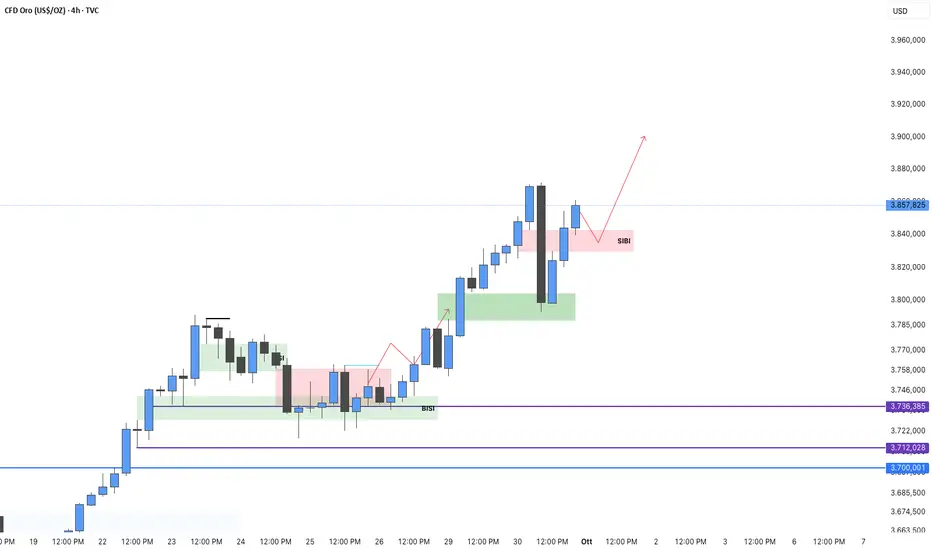 Si nota che, nonostante questa crescita di tre giorni, la volatilità rimane piuttosto bassa e la resistenza dell’ultimo HIGH probabilmente farà tornare il prezzo sull’IFVG (SIBI), per poi rimbalzare al rialzo e puntare verso la zona chiave dei 3'900 🎯