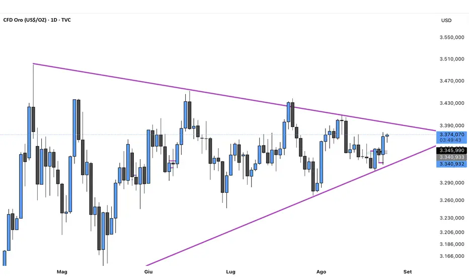Il prezzo del GOLD, dopo aver rotto l’ombra ribassista di due giorni fa, rimbalza fortemente al rialzo facendo uno SWEEP della liquidità e formando una candela rialzista molto volatile. La rottura del triangolo si avvicina e il prezzo potrebbe partire in entrambe le direzioni.