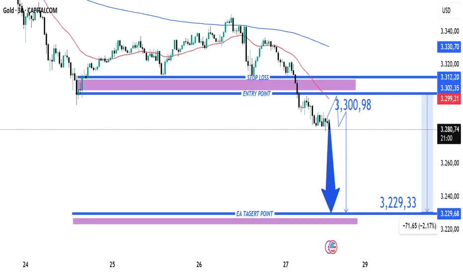 L’oro si trova in un trend ribassista evidente, con ritracciamento fino alla zona evidenziata come punto di entrata (3.300,98 USD).