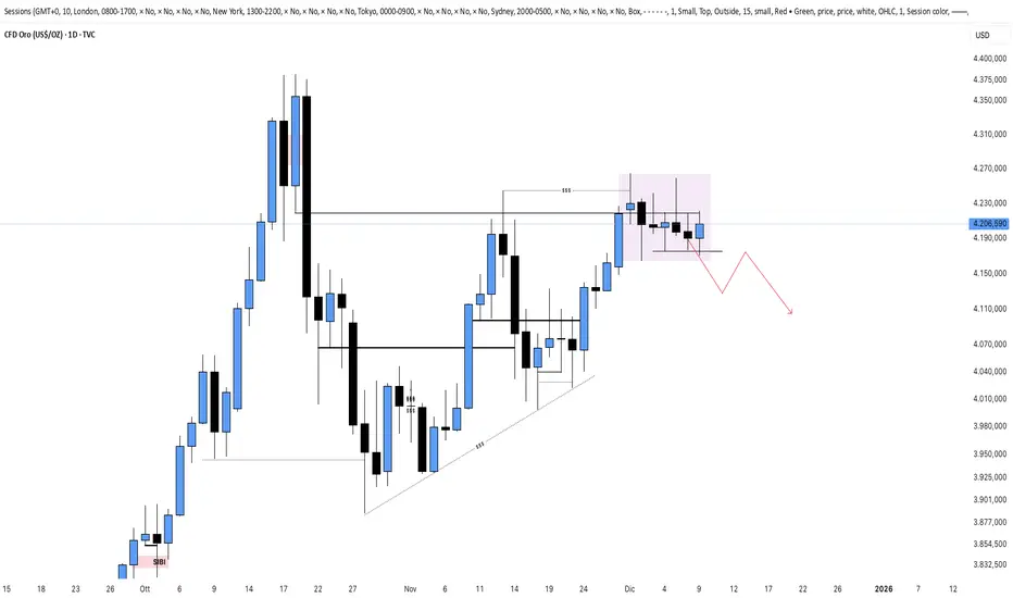 L’oro si trova in una fase di accumulazione, ma viene comunque respinto nuovamente al ribasso in corrispondenza dell’OB segnato dalla linea orizzontale.