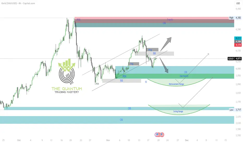 If price rejects from above at the BB zone at 4115–4120, we anticipate a bearish move back toward the OB + Demand zone, potentially into the Retracement Range, to sweep liquidity.