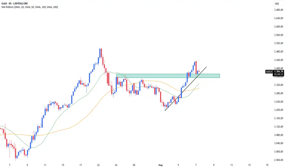 Il prezzo dell’oro ha testato con successo il supporto in zona 3355-3370 (resistenza convertita in supporto).Inoltre le attuali tensioni geopolitiche tra India e Pakistan potrebbero spingere l’oro verso nuovi massimi.