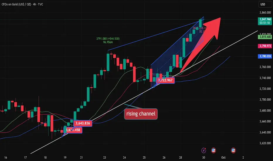 The gold market continued to rise yesterday. It opened at 3759.9 in the morning and then fell back. The daily low was 3756.3 and then the market fluctuated and rose strongly. The daily high touched the daily high of 3834.2 and then consolidated. The daily line finally closed at 3833.9. The daily line closed with a saturated large bullish candle with a slight shadow. After ending this pattern, today's market retraced to more levels. In terms of points, the long positions at 3325 and 3322 below and the long positions at 3368-3370 last week and the long positions at 3377, 3385 and 3563 were reduced and the stop loss was followed up at 3650. Today's long positions at 3805 are conservative at 3802, and the stop loss is 3798. The target is 3838, 3845 and 3852-3855 pressure.
