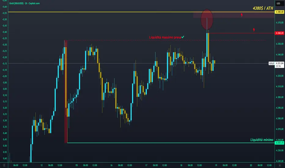 Io personalmente attenderò un ritracciamento per valutare un posizionamento SHORT, cercherò un trigger di entrata o sul massimo relativo H1 segnato con la linea ai 4360, in ricerca di liquidità del massimo giornaliero di oggi, sopra i 4375$ per oncia.