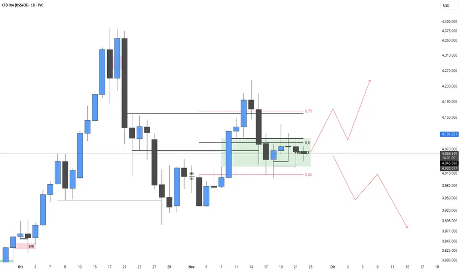 Il prezzo del GOLD da una settimana si sta accumulando nel FVG sotto lo 0,5 di FIBO.
