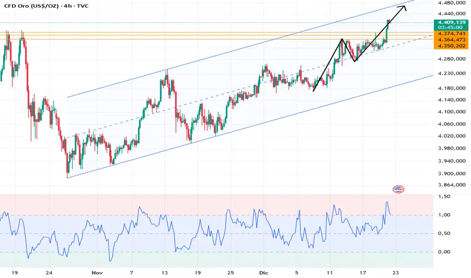 Sul grafico a 1 ora, dopo un forte movimento rialzista, il livello di 4400 è un livello chiave per una correzione a breve termine. Con le Bande di Bollinger in trend rialzista e il prezzo che ha rotto il recente intervallo di massimo consolidamento, è probabile che il trend continui. Tuttavia, è bene essere consapevoli del rischio di un pullback. Per il trading a breve termine, attendere un pullback e la formazione di un pattern di bottoming prima di entrare.