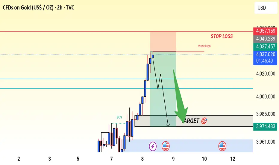 Gold has formed a weak high near 4057 after a strong bullish move. Price failed to sustain above this level and is now showing signs of reversal. A break of structure confirms bearish momentum, targeting the 3974 support zone. Stop loss remains above the weak high for protection.