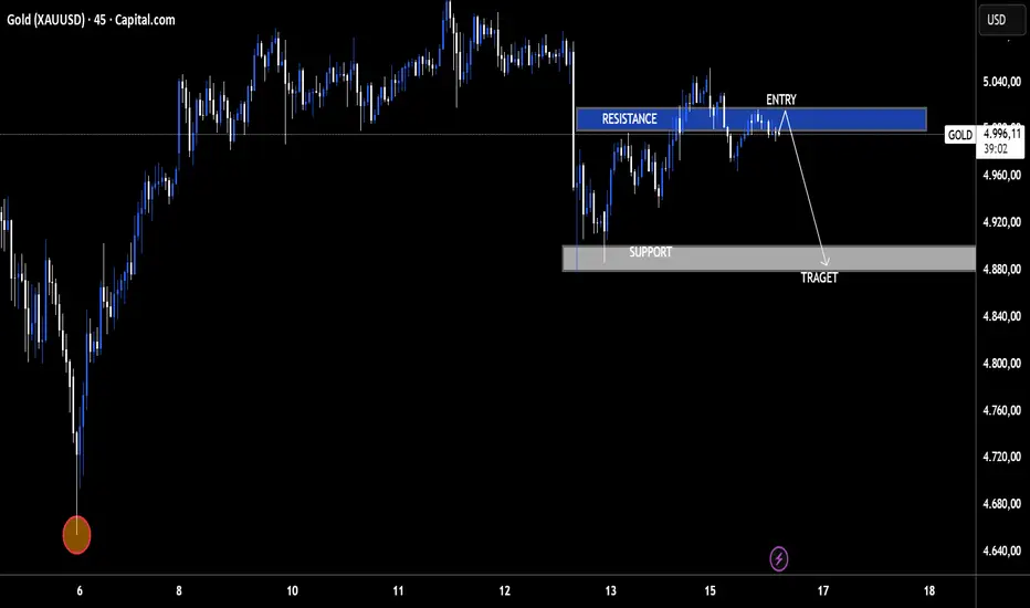 Il grafico a 45 minuti di Gold (XAUUSD) mostra una chiara reazione su una zona di resistenza intorno a 5.000. La struttura suggerisce un possibile scenario short con obiettivo verso la zona di supporto tra 4.880 e 4.900.