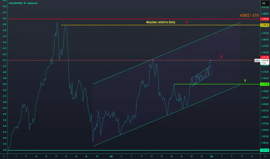 Dato il rifiuto che c'è stato potrei aspettarmi un ritracciamento a ribasso prima di riprende a rialzo, direzione iniziale il target dei 4127$ per oncia, segnata con la linea verde, poi andiamo verso la parte bassa del canale rialzista grande.