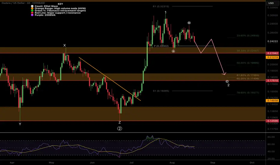 Wave (c) appears to be underway with a target of the golden pocket and major support High Volume Node at $0.175.