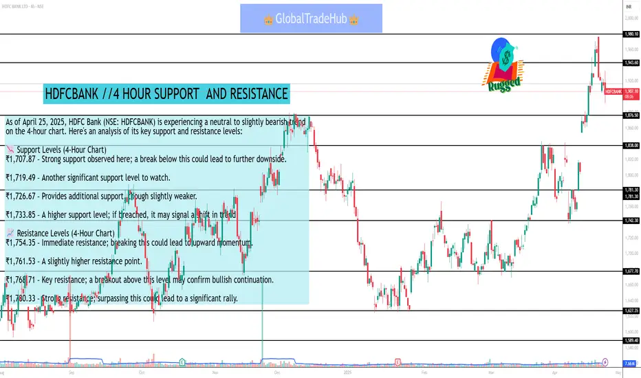 As of April 25, 2025, HDFC Bank (NSE: HDFCBANK) is experiencing a neutral to slightly bearish trend on the 4-hour chart. Here's an analysis of its key support and resistance levels: