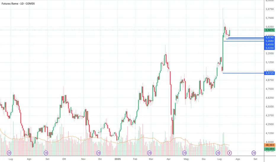 Il rame (HG1!) sta testando un'importante resistenza tecnica intorno a 5.60–5.62. Il trend è rialzista da aprile, con minimi crescenti e buoni volumi. Possibile breakout se il prezzo chiude sopra l'area con forza. Supporti a 5.50, 5.30 e 5.00. Sto valutando un long se la struttura regge.