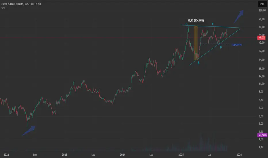 Il bel trend rialzista del titolo è iniziato nel maggio del 2022 in area 3$. I massimi assoluti (punto A) sono stati realizzati il 19 febbraio 2025 attorno ai 73$. Negli ultimi mesi si è formato un triangolo rialzista (con i quattro punti di contatto indicati dalle lettere) che potrebbe portare a un proseguimento del trend. Nell’ultima seduta HIMS ha perso quasi il 16% in seguito ad alcune dichiarazioni di Trump sui farmaci dimagranti. Ulteriori discese potrebbero compromettere il pattern. Molto importante il supporto in area 40$ in corrispondenza della linea inferiore del triangolo. In caso di breakout un possibile target di prezzo sarebbe pari alla distanza del punto B dalla linea superiore del triangolo (circa 50$), il che proietterebbe il titolo in area 120$.