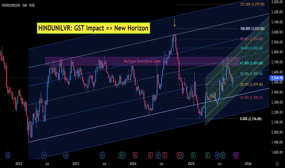 • Uptrend (March to July 2025): A strong rebound began in late March, with the price climbing in a series of higher highs and lows to peak around ₹2,750 by July. Green candlesticks dominated, supported by rising volume during breakouts. This rally (~30.1% from Swing low) likely coincided with Unilever's positive first-half results announced in July, boosting investor confidence in volume recovery. The CEO transition announcement around this time may have added to the optimism.