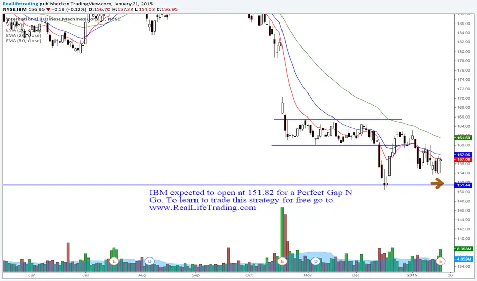 IBM expected to open at 151.82 for a Perfect Gap N Go. To learn to trade this strategy for free go to RealLifeTrading.com