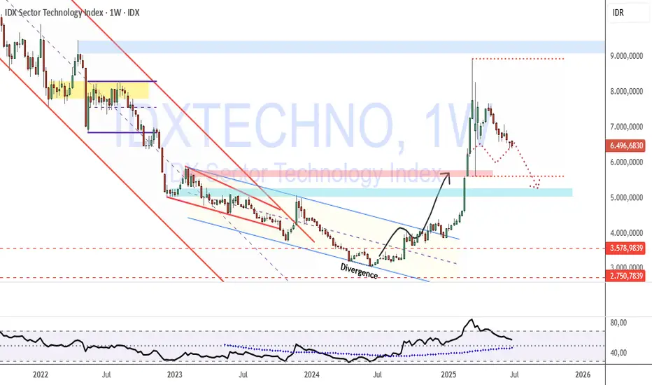IDXTECHNO masih di dalam Sideways setelah kenaikan jauh sebelumnya, berpotensi turun ke SUPPORT mengambil tenaga