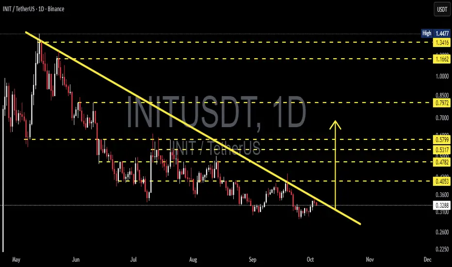 INIT/USDT has been in a clear downtrend since its peak earlier this year. The yellow descending trendline connecting the series of lower highs continues to act as a major dynamic resistance. Current price is trading around $0.3295, right at a critical decision zone.
