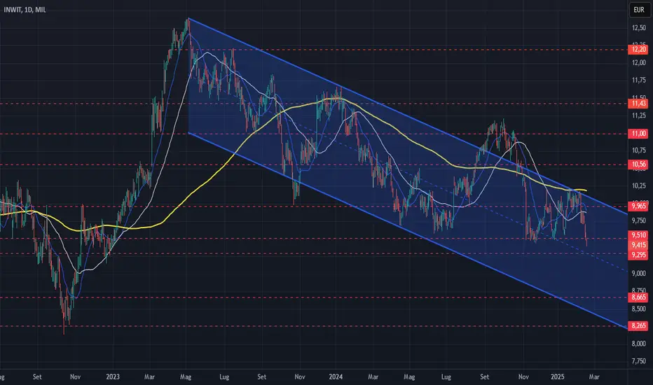 Il prezzo del titolo Inwit conferma la rottura ribassista dell'area di supporto statico dei 9,51 Euro, i successivi supporti statici sono in area 9,29 Euro e 8,66 Euro.