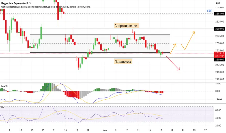 Ключевое: поддержка 2500, сопротивление район 2580-2600, пробой одного из уровней укажет дальнейшее направление рынка, либо 2650-2700, либо плавный уход в течение недели в район 2400-2430.