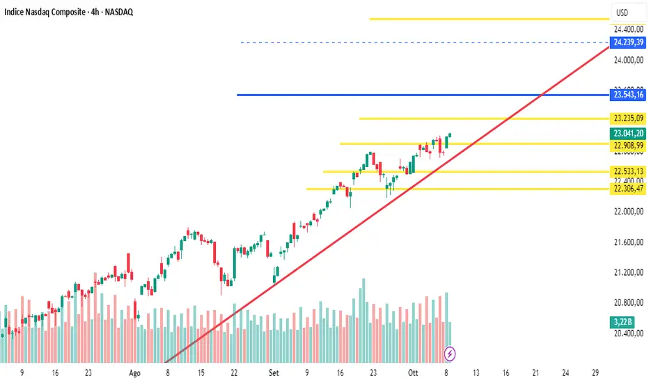 Il Nasdaq mostra una struttura rialzista più matura, sostenuta da una serie di higher lows ben definiti.